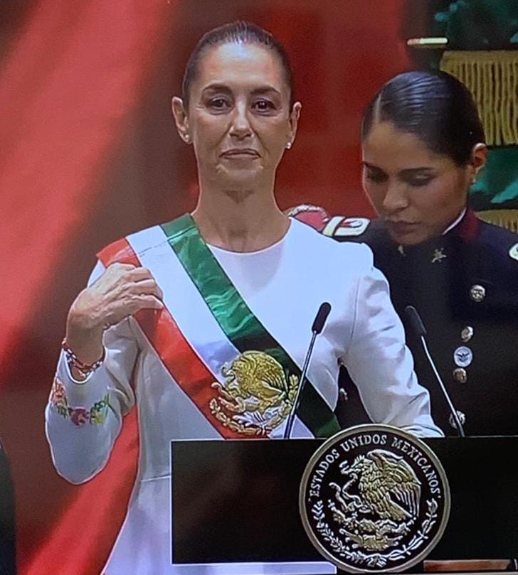 Minutos después la doctora Claudia Sheinbaum Pardo hizo su entrada triunfal al Recinto de San Lázaro, misma quien fue vitoreada con la frase «es un honor estar con Claudia hoy», quien a la postre de su toma agradeció la presencia y el apoyo de todo el país, así como la presencia de los más de 105 países representados en el acto. Agradeció también a los 23 organismos internacionales que se hicieron presentes; para después externar su gratitud a Andrés Manuel López Obrador, a quien distinguió como el «dirigente de la historia moderna de México», el «mejor presidente de México», el «presidente más querido de México» y el iniciador de la revolución pacífica de la 4T; «por lo que siempre estará en el corazón del pueblo de México»; afirmó, Sheinbaum Pardo.