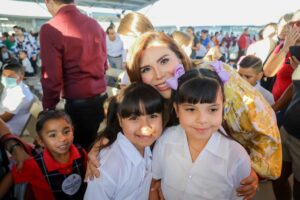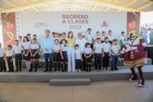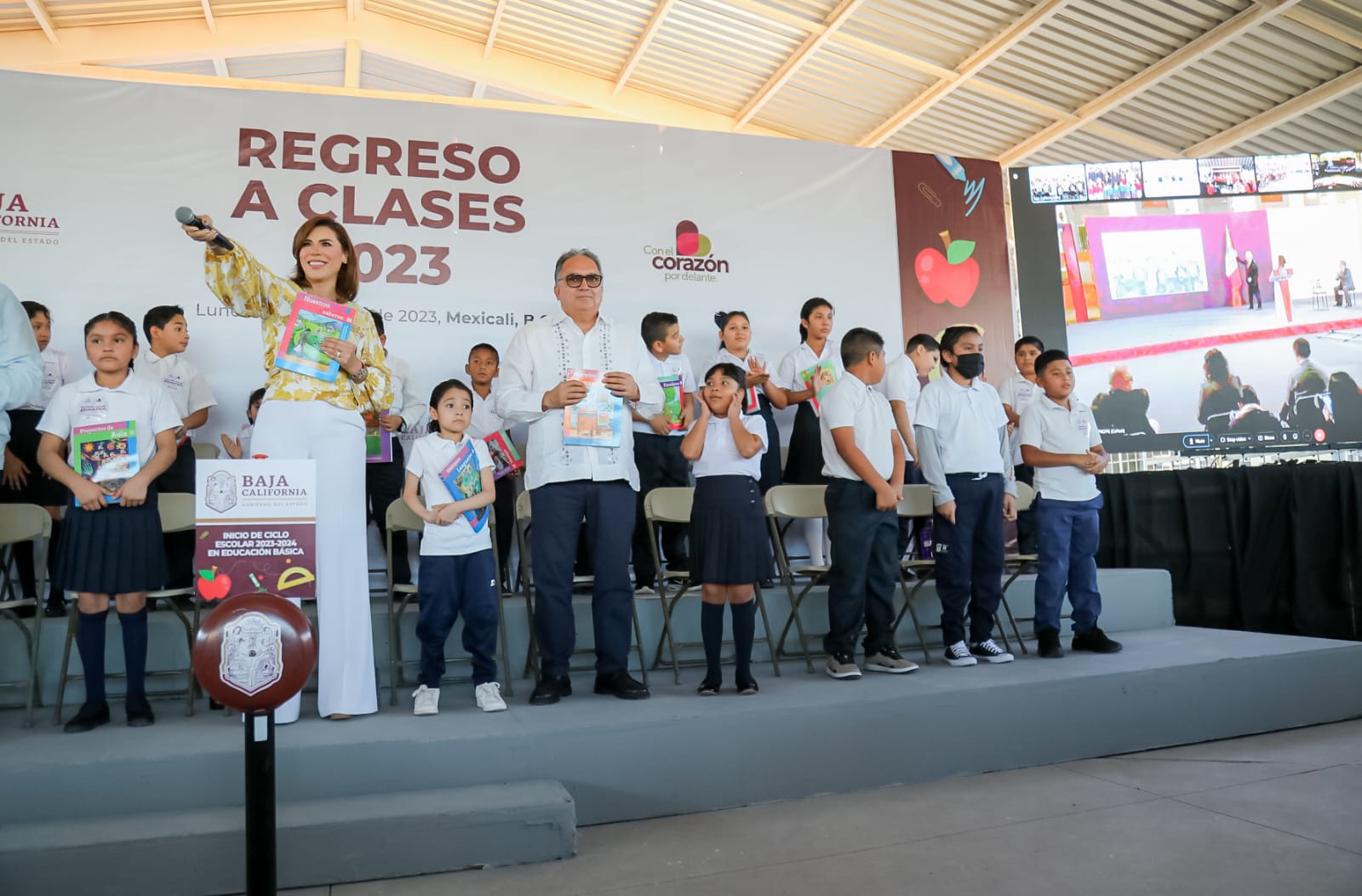 MEXICALI BC, 28 de agosto de 2023.- En contacto directo con niñas, niños, madres y padres de familia, docentes, personal administrativo y toda la comunidad escolar, la gobernadora de Baja California, Marina del Pilar Avila Olmeda, encabezó el arranque del ciclo escolar 2023-2024 para más de 660 mil estudiantes de educación básica, y respaldó la entrega de más 4.2 millones de Libros de Texto Gratuito en más de tres mil escuelas en el Estado, por ser instrumentos para formar a mejores profesionistas, ciudadanas y ciudadanos, así como seres humanos con un desarrollo integral.