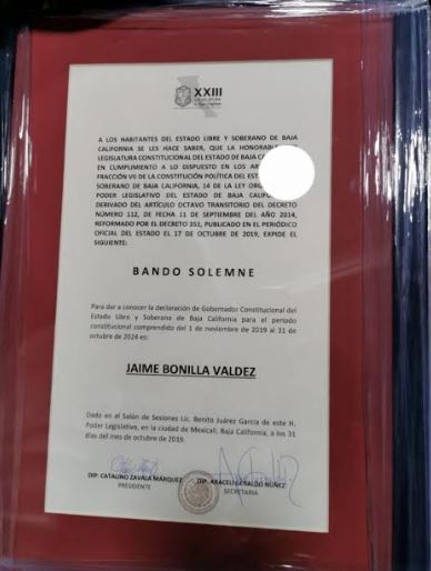 Tijuana, B.C. 02 de Noviembre 2019… Fue la presidenta de la comisión de coordinación política de la XXIII Legislatura Montserrat Caballero Ramírez quien hizo entrega al c. Jaime Bonilla Valdez el bando solemne para auto proclamarse gobernador constitucional del estado de Baja California en los primeros minutos de la madrugada del día primero de noviembre del 2019 y se convertiría en el gobernador número 14 desde que Baja California es un estado libre y soberano.