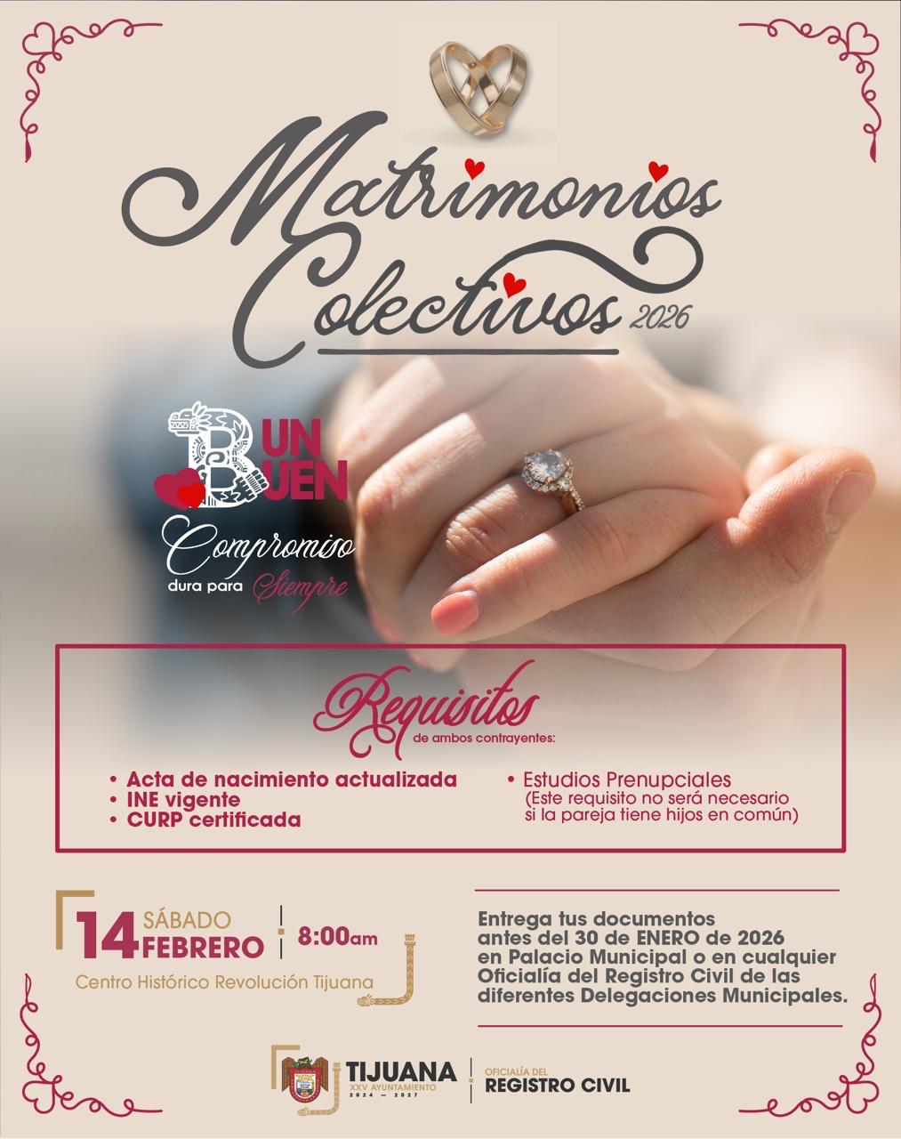 TIJUANA BC, 15 de enero de 2026.- Al corte del 15 de enero, un total de 485 parejas se encuentran inscritas en la campaña de Matrimonios Colectivos 2026 que impulsa el XXV Ayuntamiento de Tijuana, con el objetivo de fomentar la formalización de la unión entre parejas y brindar certeza jurídica a las familias.