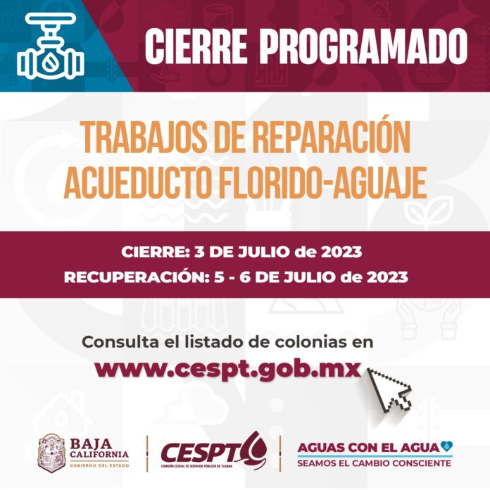 TIJUANA BC, 29 de junio de 2023.- El suministro de agua quedará interrumpido a las cero horas del lunes 3 de julio, y posterior a 42 horas de trabajo, en 632 colonias de Tijuana y Playas de Rosarito, así lo anunció la Comisión Estatal de Servicios Públicos de Tijuana (CESPT) a través de un comunicado de prensa, en donde también señalan que este corte obedece a que se ejecutará la tercera y última etapa de las obras de rehabilitación del Acueducto Florido-Aguaje en Tijuana.