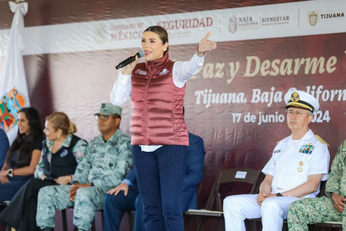 TIJUANA BC, 17 de junio de 2024.- La gobernadora de Baja California, Marina del Pilar Avila Olmeda, acompañada de representantes de las fuerzas armadas y residentes de la ciudad de Tijuana, encabezó la Feria de Paz y Desarme Voluntario, donde las personas entregaron de forma voluntaria armas en un módulo dirigido por elementos de la Secretaría de la Defensa Nacional (SEDENA), y recibieron asistencia social por parte de las diversas áreas que componen el Gobierno del Estado.