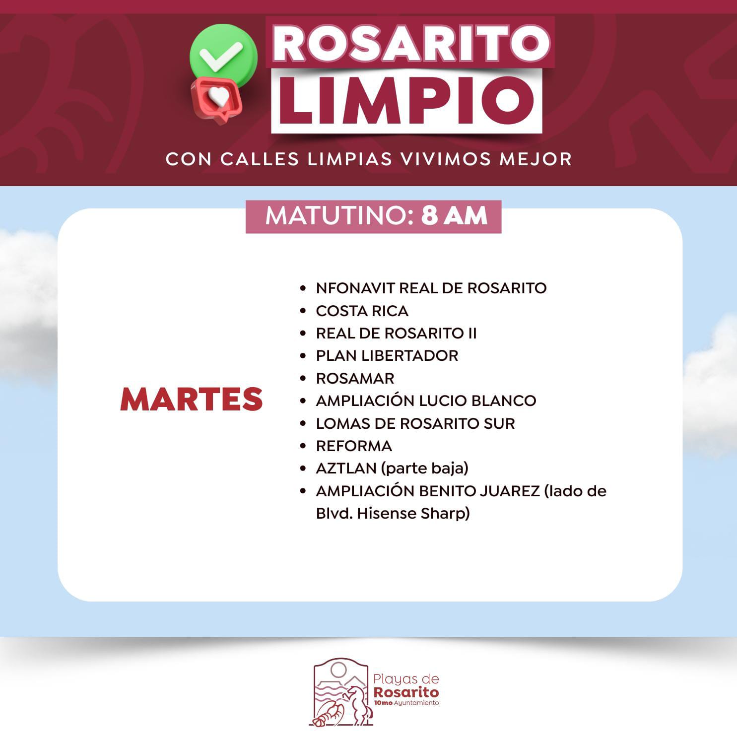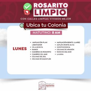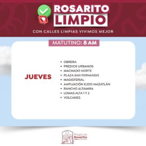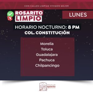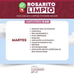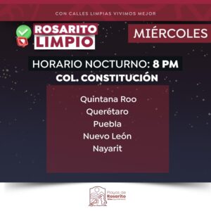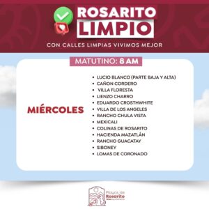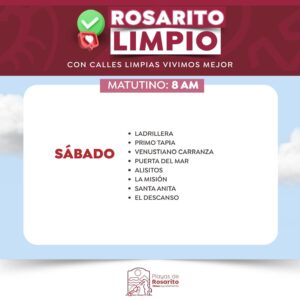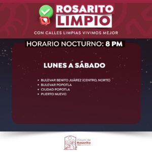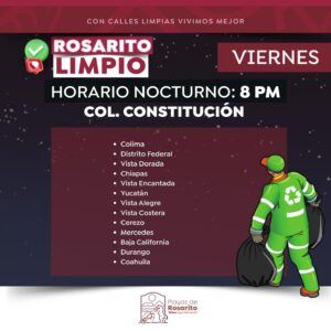 Playas de Rosarito.- El Gobierno Municipal de Playas de Rosarito  informó a la comunidad sobre los horarios actualizados del programa «Rosarito Limpio»,  cuyo objetivo es la recolección de basura, a través de la implementación de un esquema de servicio diurno y nocturno en zonas específicas de dicho municipio.