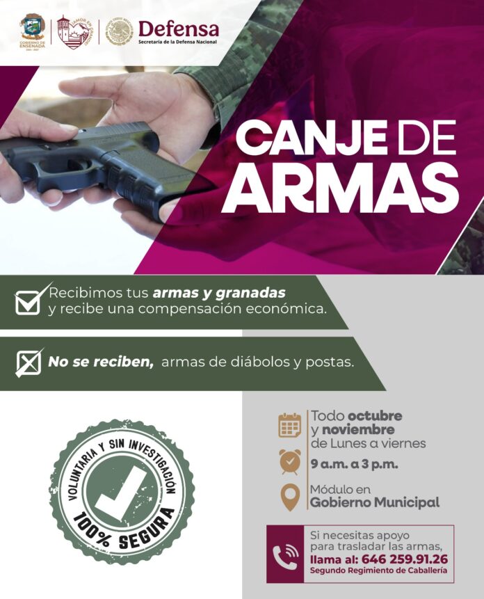 Ensenada.- El Gobierno de Ensenada, en coordinación con la Secretaría de la Defensa Nacional (Sedena), hacen un llamado a la población a participar en la Campaña de Canje de Armas de Fuego.