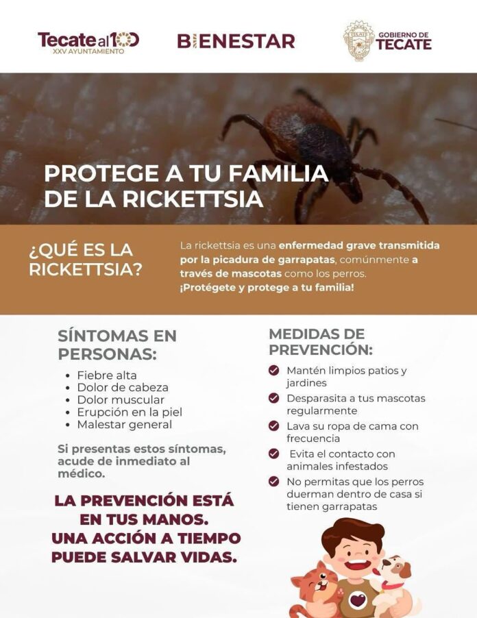 Tecate.– La Dirección de Bienestar del municipio de Tecate, informó a la ciudadanía sobre la importancia de tomar medidas preventivas ante la presencia de la rickettsia, enfermedad categorizada como grave y transmitida por la picadura de garrapatas, comúnmente a través de mascotas como los perros.