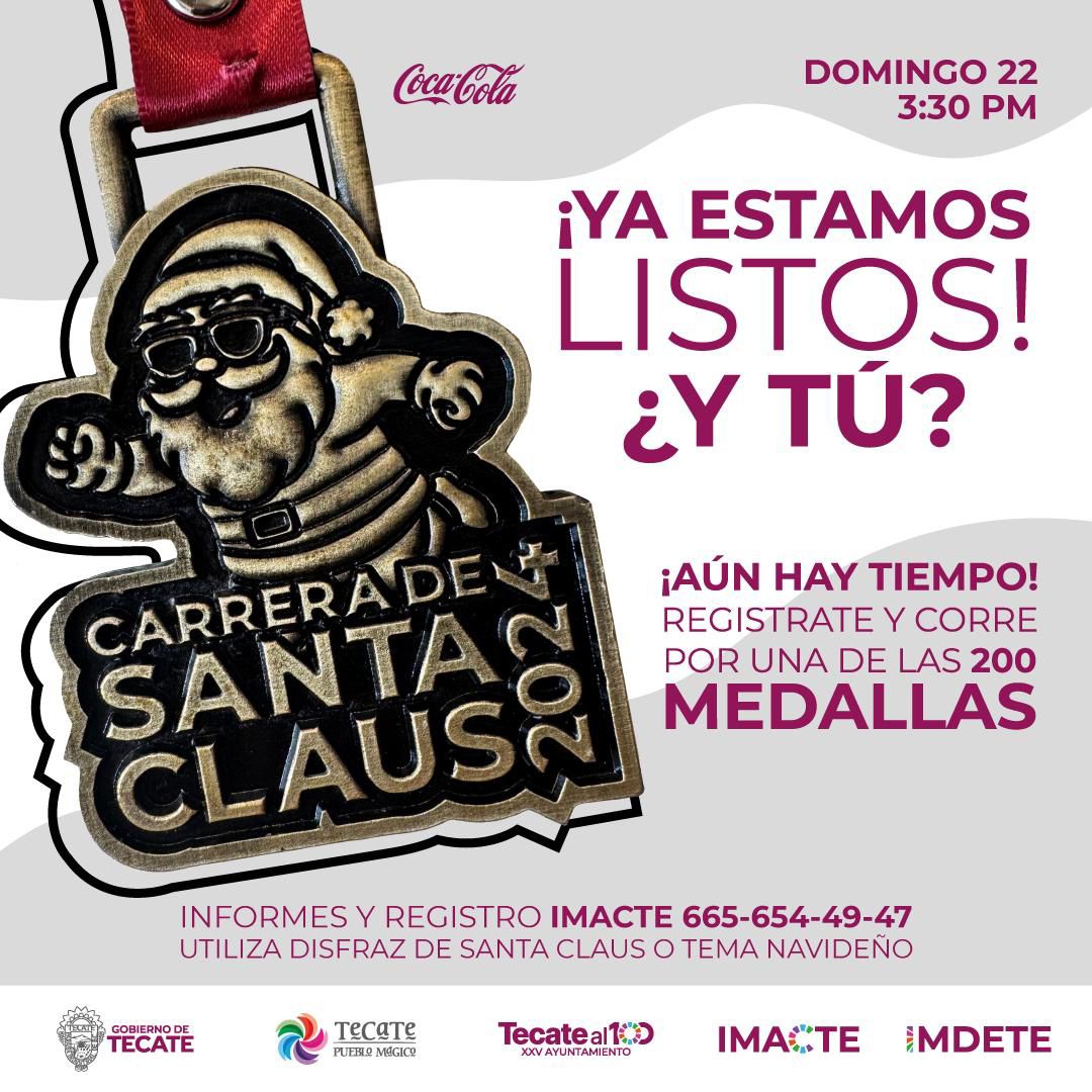 Tecate.- El Ayuntamiento de Tecate invita a la población  a participar en la Carrera de Santa Claus. La cita es a partir de las 2:00 p.m. en el Parque Miguel Hidalgo, donde se llevará a cabo el registro de los participantes.
