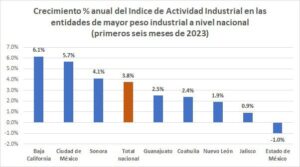 En el acumulado de los primeros seis meses de 2023, el mejor desempeño en cuanto a aportaciones de la industria a la economía nacional fue de Baja California con 6.1 por ciento del total, seguido de Ciudad de México con 5.7, Sonora con 4.1 y Guanajuato con 2.5.