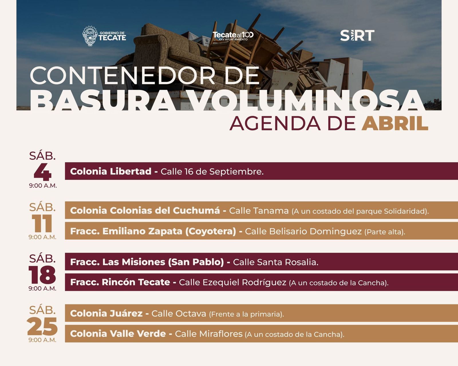 Tecate.-  Promover una ciudad limpia, ordenada y libre de focos de infección es la prioridad del Gobierno de Tecate, que este viernes dio a conocer el calendario oficial de abril para su exitoso programa “Contenedor de Basura Voluminosa”. A través de esta estrategia, se facilita a las familias un espacio adecuado para depositar artículos de gran tamaño que el servicio de recolección regular no puede trasladar.