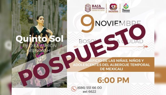 MEXICALI BC, 09 de noviembre de 2022.- Debido a las condiciones climáticas que prevalecen en la capital del Estado este miércoles 9 de noviembre, y con el objetivo de cuidar la seguridad de las y los participantes y asistentes al evento con causa “Quinto Sol, El Arte hecho Moda”, que DIF Baja California está organizado en apoyo a las niñas, niños y adolescentes del Albergue Temporal de Mexicali, se pospone hasta nuevo aviso.