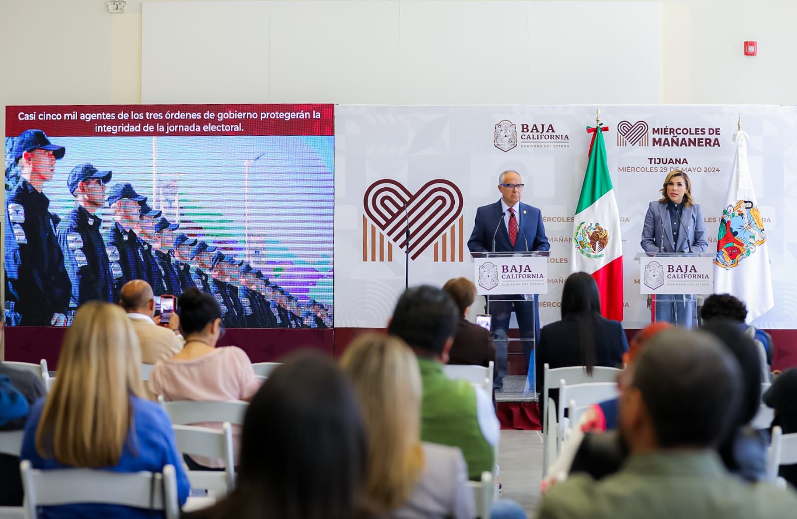 TIJUANA BC, 29 de mayo de 2024.- En el marco de las próximas elecciones del 2 de junio de 2024, las más grandes en la historia de México, la gobernadora de Baja California, Marina del Pilar Avila Olmeda, informó sobre las acciones que se están llevando a cabo, de manera coordinada con los tres órdenes de gobierno, para garantizar la seguridad de este ejercicio democrático en el que podrán participar 3.1 millones de bajacalifornianas y bajacalifornianos.