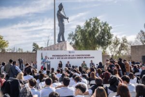 Señaló que la Carta Magna es el fruto de una historia de luchas y conquistas durante el periodo revolucionario que, derivaron en un texto que reivindica derechos sociales como la educación laica y gratuita, así como derechos laborales y agrarios haciendo de México un país más justo y democrático.