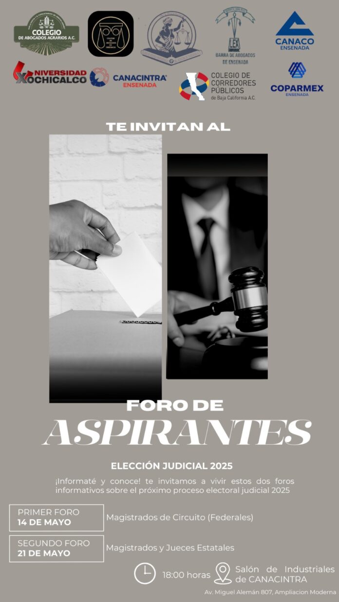 En el llamado “Foro Ciudadano”, acuden aspirantes a magistrados del poder judicial federal el 14 de mayo a las 6 de la tarde en las instalaciones de Canacintra Ensenada y para aspirantes al poder judicial estatal, el miércoles 21 de mayo a la misma hora y lugar.