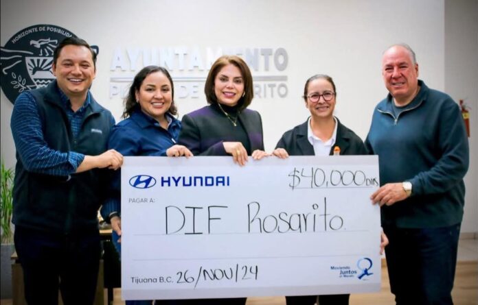 PLAYAS DE ROSARITO BC, 27 de noviembre de 2024. – La presidenta municipal, Rocio Adame Muñoz, expresó su profundo agradecimiento a Hyundai de México por la entrega de un donativo por $40,000 Dólares al Sistema para el Desarrollo Integral de la Familia (DIF) Municipal de Rosarito.