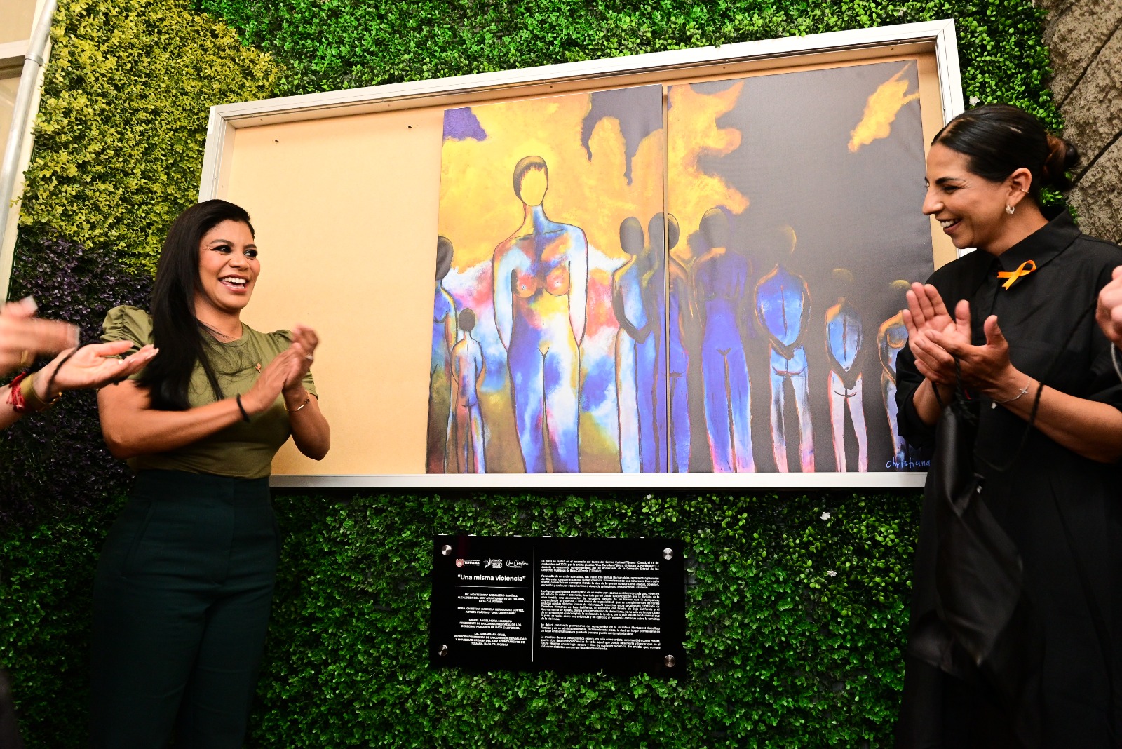 “Esta obra representa todas las violencias, y estamos gratamente sorprendidos porque la pintaste en un par de horas, hay que reconocerte como artista que intentaste hacer una obra de acercamiento con los colectivos de mujeres para que también plasmaran su sentir, mi reconocimiento porque eres una artista que une mujeres, que tienes el significado de la violencia, por eso le dimos un espacio muy especial en esta pared a tu trabajo”, reconoció la alcaldesa Montserrat Caballero al recibir esta obra titulada “Una misma Violencia” de manos de la artista plástica.