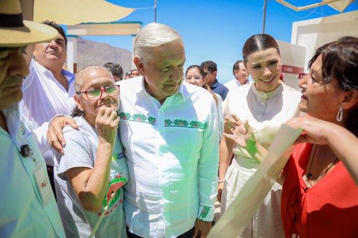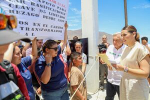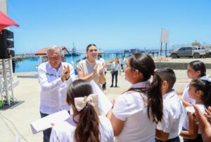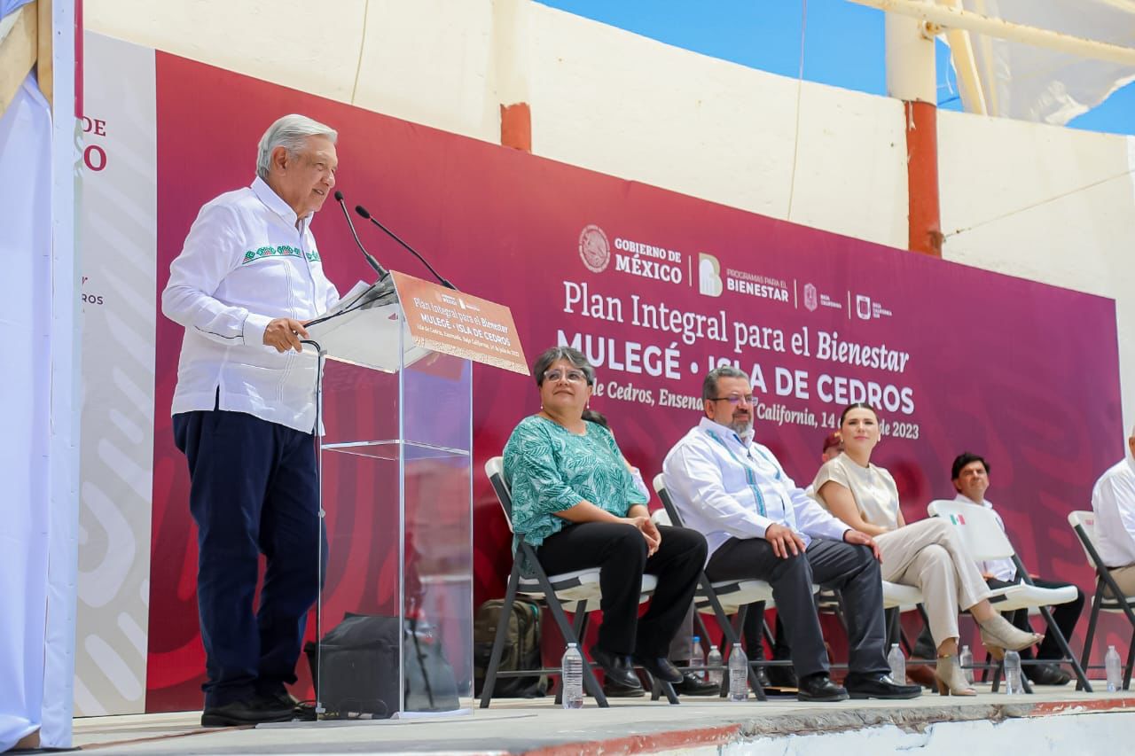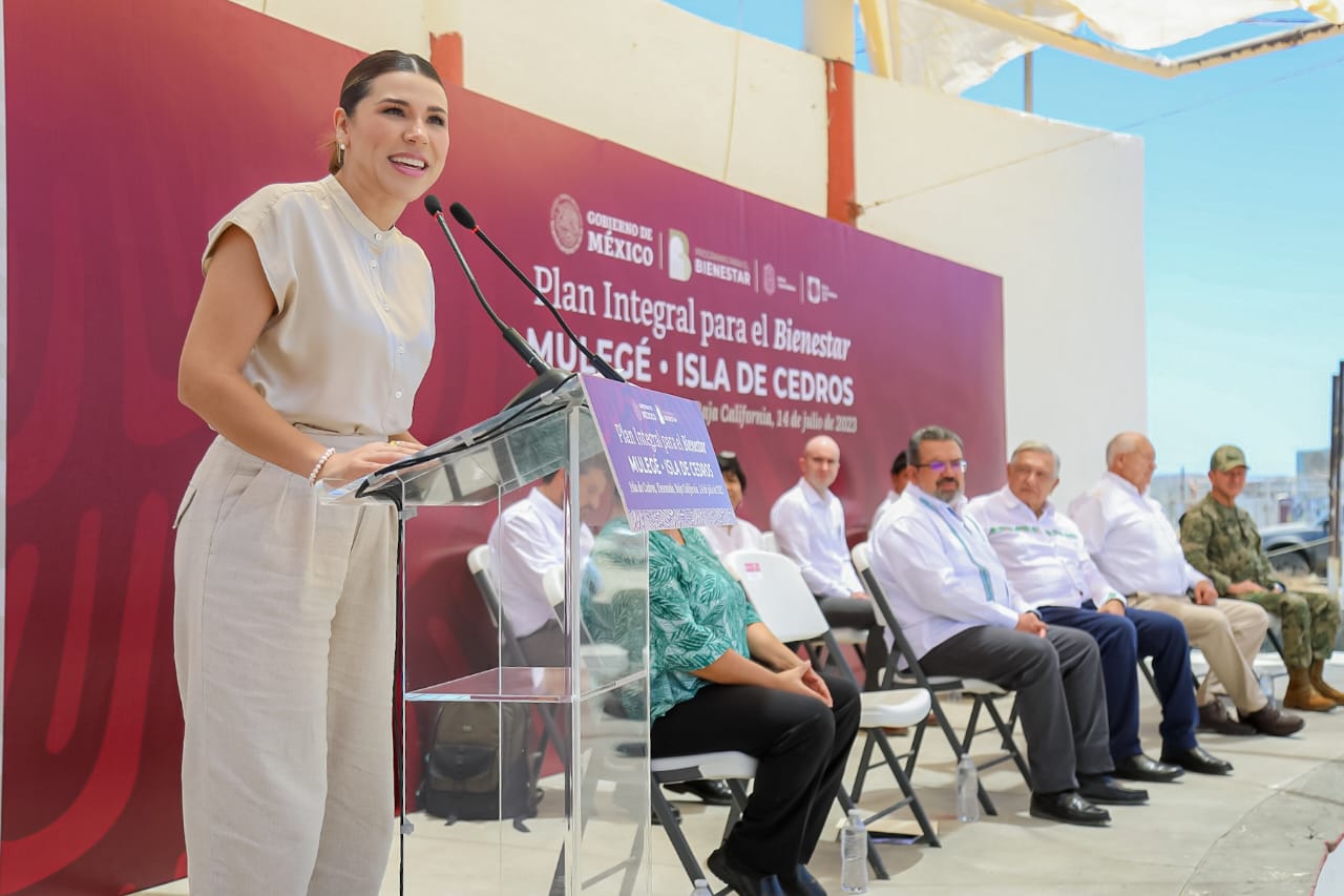 ISLA DE CEDROS, ENSENADA BC, 14 de julio de 2023.- Junto al presidente de México, Andrés Manuel López Obrador, la gobernadora de Baja California, Marina del Pilar Avila Olmeda, presentó en Isla de Cedros el Plan Integral para el Bienestar Mulegé – Isla de Cedros en el que las administraciones federal y estatal suman esfuerzos para atender las necesidades de toda la población e impulsar el desarrollo de las comunidades que viven en la zona fronteriza entre Baja California y Baja California Sur.