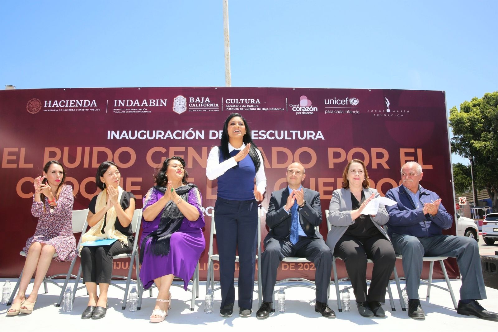 Durante la inauguración, Sandra Benito, representante del artista, mencionó que el significado de la obra “El ruido generado por el choque de los cuerpos”, representa una pieza que invita a reflexionar para generar conciencia e inclusión en un tema tan emblemático como la migración.