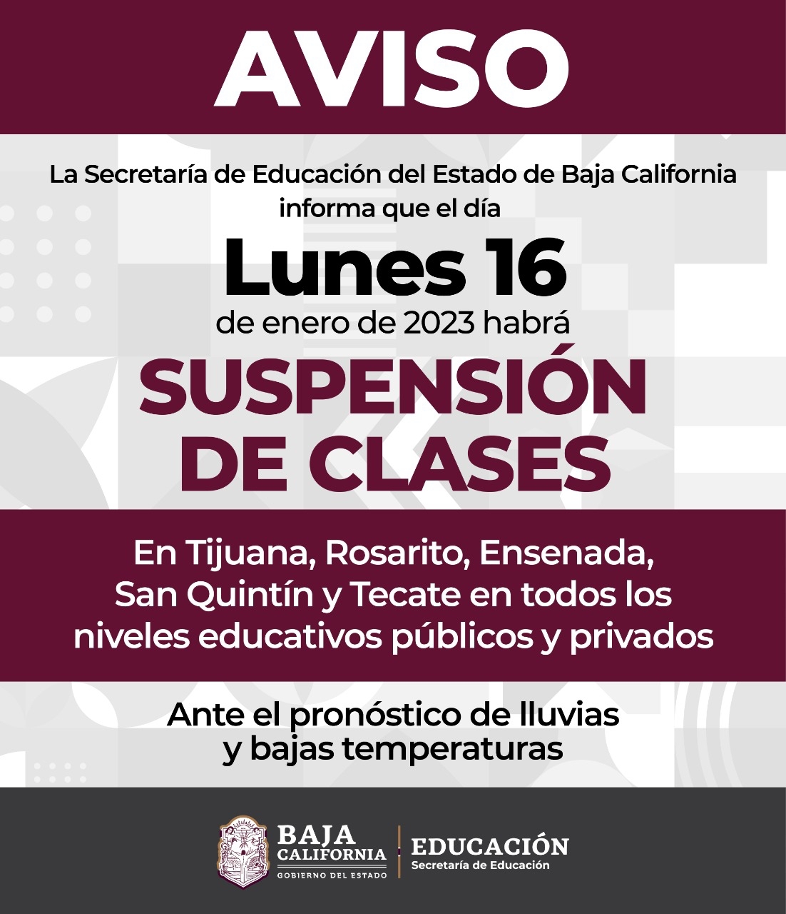 TIJUANA BC, 15 de enero de 2023.- Con el fin de proteger a la comunidad estudiantil de los riesgos por las lluvias, este lunes 16 de enero se suspenderán las clases en Tijuana, Playas de Rosarito, Tecate, Ensenada y San Quintín, derivado de la recomendación emitida por la Coordinación Estatal de Protección Civil (CEPC), la Secretaría General de Gobierno (SGG) y la Secretaría de Educación (SE).