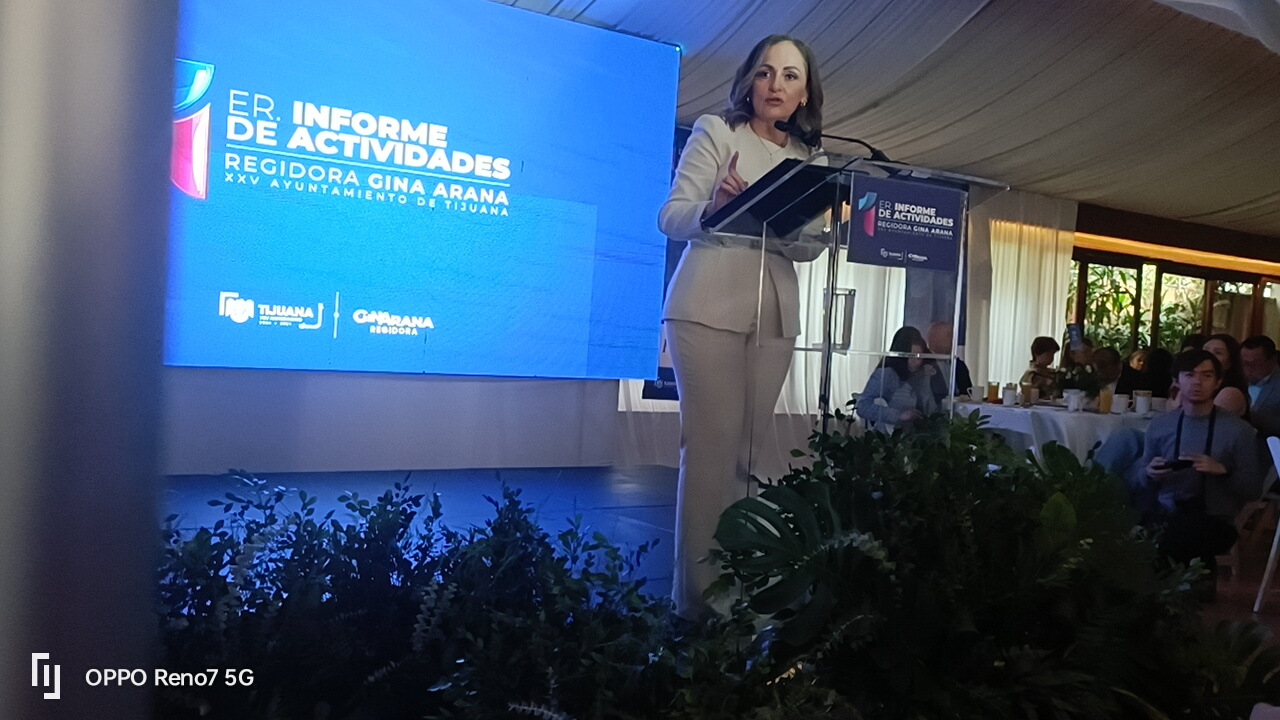 TIJUANA BC, 28 de octubre de 2025.- “Desde que inicié en el servicio público y hoy como su Regidora de reelección continua, tengo muy presente la necesidad de trabajar por una ciudad mejor», así inició su discurso la regidora de extracción panista Gina Arana durante su primer informe como regidora del XXV Ayuntamiento de Tijuana, ante un concurrido recinto ubicado en la Zona Río de la ciudad el pasado fin de semana, donde se congregó una diversa audiencia de todas las representaciones políticas y funcionarios en activo.
