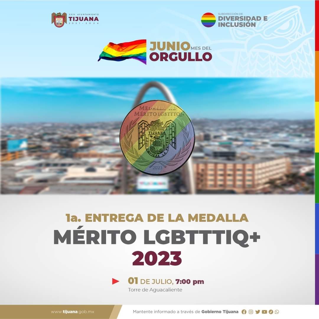 TIJUANA BC, 14 de junio de 2023.- El Ayuntamiento de Tijuana, otorgará por primera ocasión la Medalla al Mérito LGBTTTIQ+, Nancy Cárdenas 2023, máxima distinción entregada a personas originarias o residentes que a través de sus acciones, profesiones y luchas, han conquistado derechos políticos y sociales para integrantes de este sector, o bien que con su talento y trabajo han llevado el nombre de esta ciudad por el mundo.