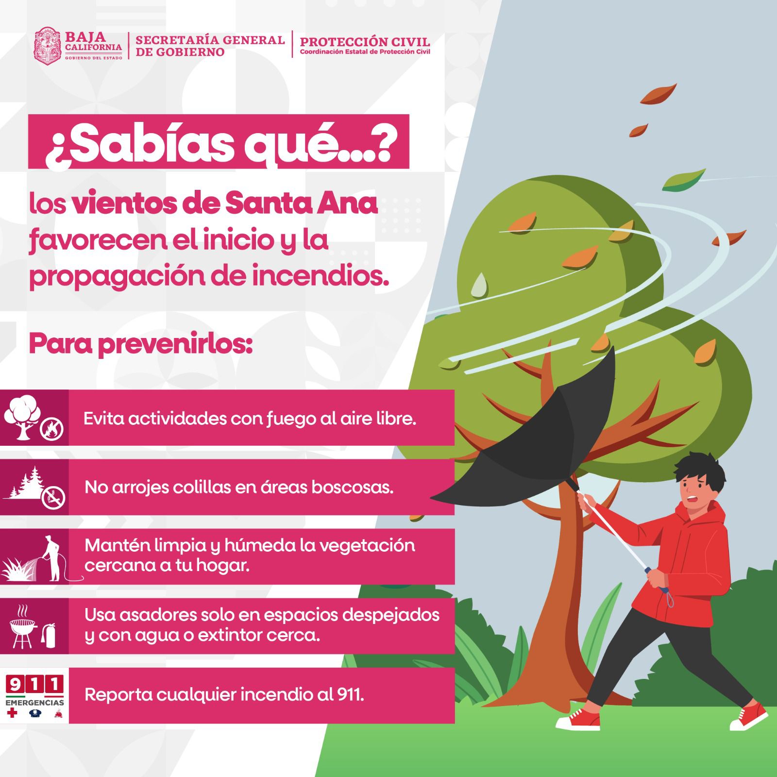 TIJUANA BC, 08 de diciembre de 2024.– La Coordinación Estatal de Protección Civil (CEPC) de Baja California informa a la población sobre la entrada de vientos de Santa Ana a partir del lunes 9 de diciembre, condición meteorológica que traerá aire extremadamente seco a las zonas montañosas y valles del estado, propiciando la propagación de incendios.
