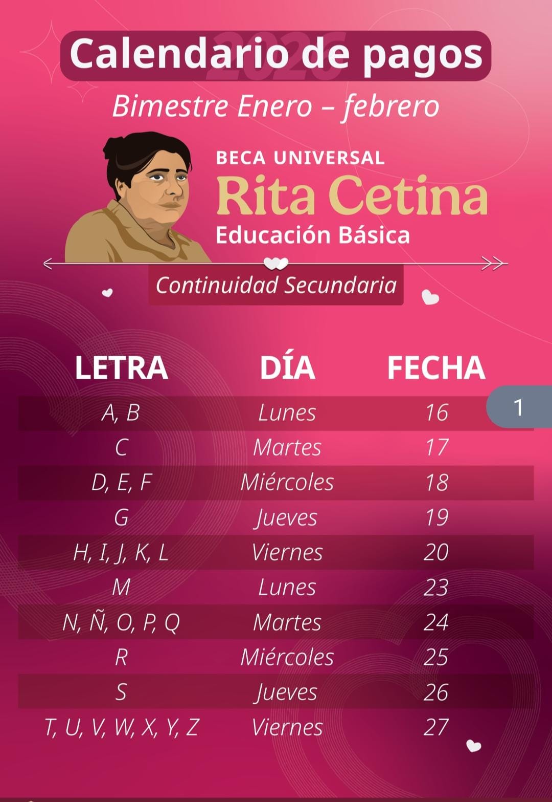 TIJUANA BC, 16 de febrero de 2026.- La organización de la beca «Rita Cetina» anunció su calendario de pagos a sus beneficiados, el cual se realizará del 16 al 27 de febrero para estudiantes de educación básica.