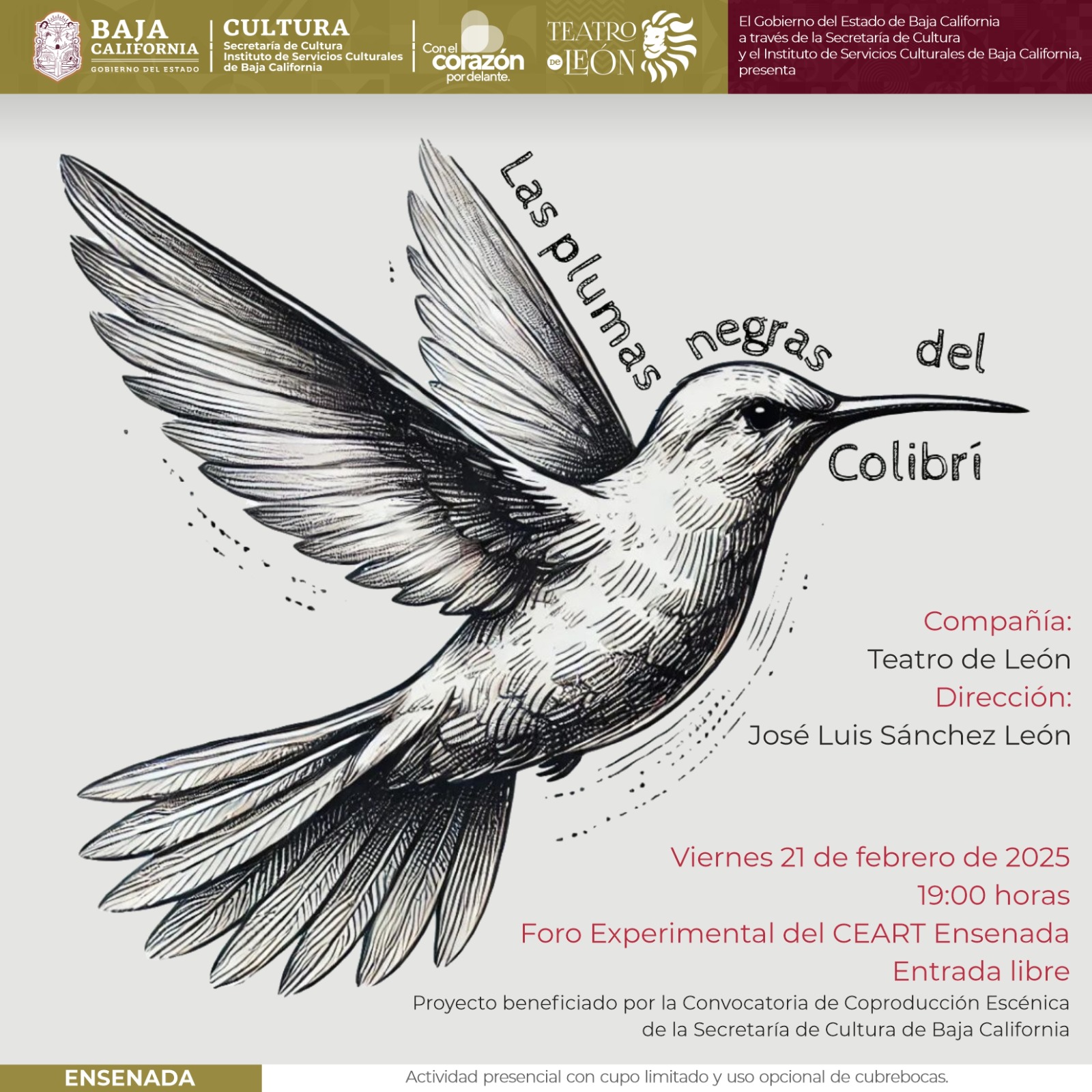 Otro de los montajes ganadores es «Las Plumas Negras del Colibrí», de la compañía Teatro de León, dirigida por José Luis Sánchez León. La obra reflexiona sobre la crisis de paz y reconciliación en contextos marcados por la violencia, situando a Tijuana y Baja California como epicentros de esta problemática. Se presentará en el CEART Ensenada a las 19:00 horas, el mismo día 21.