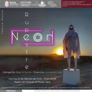 Uno de los proyectos seleccionados es «Neón Rupestre», propuesta de teatro-danza de la compañía Bajo la Lápida, bajo la dirección de Armando Leal Sánchez. La obra explora la identidad baja californiana a través de seres inspirados en las pinturas rupestres del estado, fusionando elementos tradicionales con una estética contemporánea. Se presentará en el Teatro del Estado el 21 de febrero a las 19:00 horas.