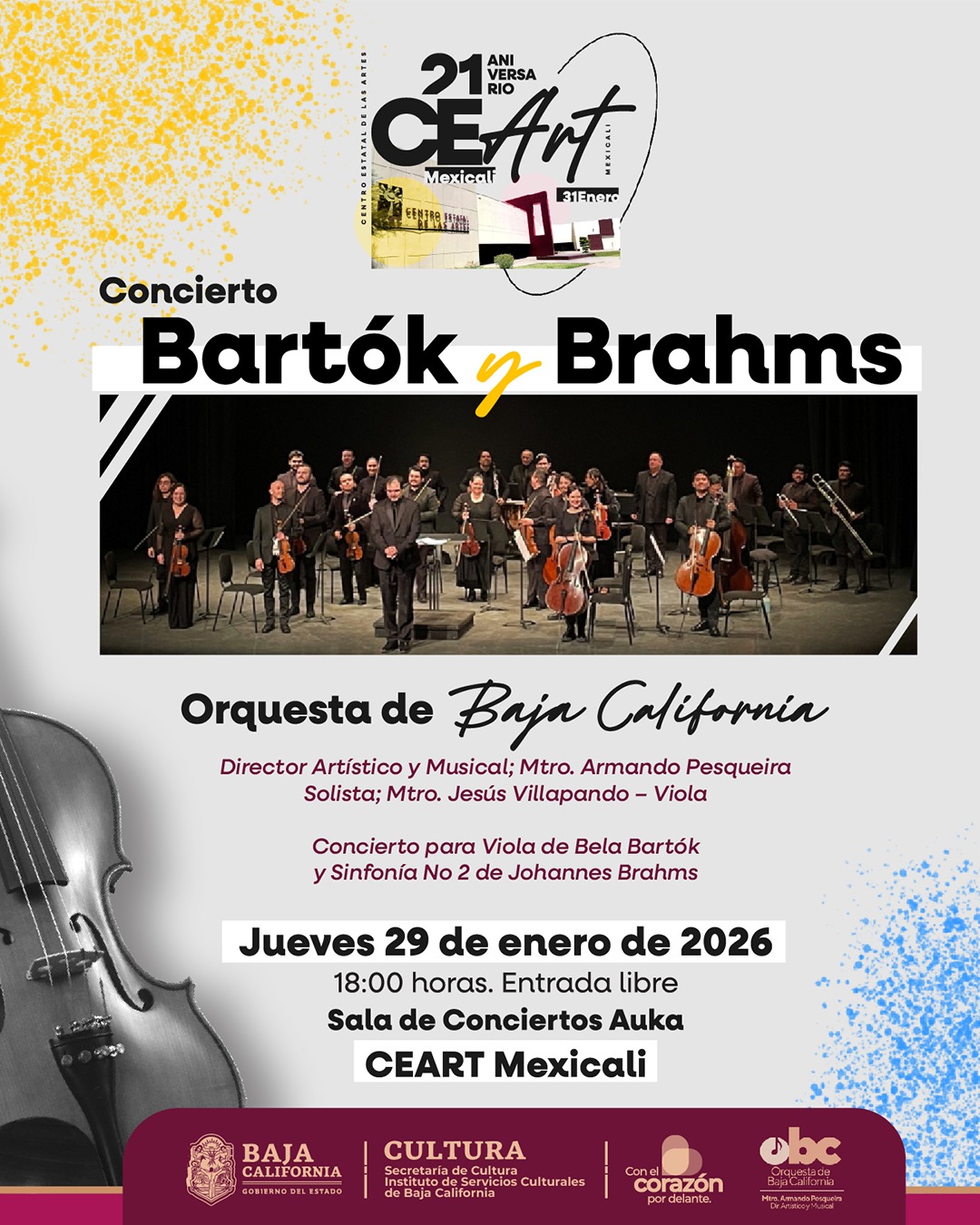 La primera presentación de la temporada se llevará a cabo el próximo 29 de enero en el CEART Mexicali, en el marco del XXI aniversario de este recinto cultural. En esta ocasión, el programa incluirá obras de Béla Bartók y Johannes Brahms, con la interpretación de un concierto para viola a cargo del Mtro. Jesús Villalpando como solista invitado. El concierto será de entrada libre, con cupo limitado a 450 personas.