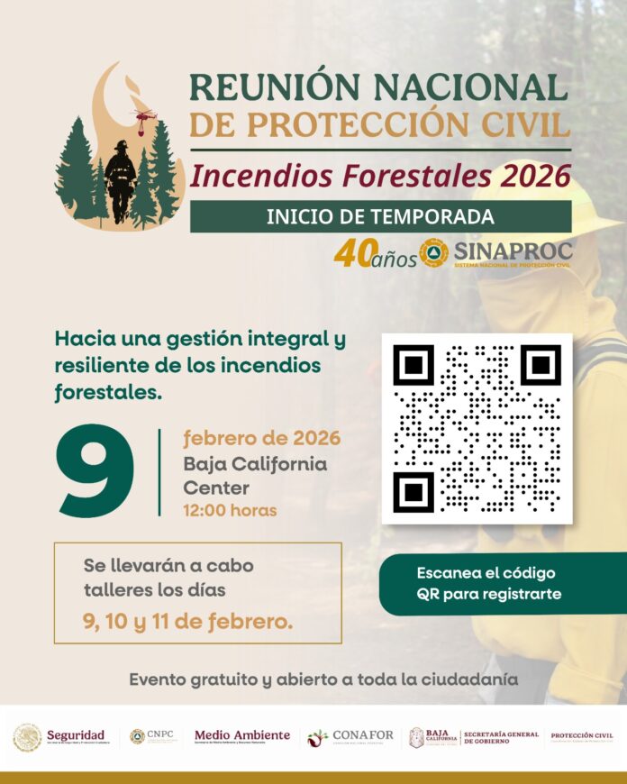 PLAYAS DE ROSARITO BC, 16 de enero de 2026.- En el marco del 40 aniversario de la creación de la Coordinación Nacional de Protección Civil (CNPC), Baja California tiene el honor de ser la entidad seleccionada para ser el estado anfitrión de la Reunión Nacional para la temporada de Incendios Forestales, por lo que la Coordinación Estatal de Protección Civil (CEPC) extiende una cordial invitación a brigadistas, cuerpos de emergencia y público en general al evento que será inaugurado el próximo 9 de febrero a las 12:00 p.m.