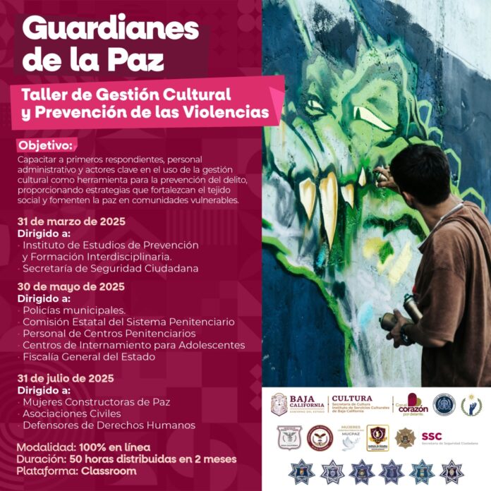 MEXICALI BC, 27 de marzo de 2025. – La Secretaría de Cultura ofertará la primera edición del Taller en Gestión Cultural y Prevención de las Violencias “Guardianes de la Paz”, a personal administrativo y operativo del Instituto de Estudios de Prevención y Formación Interdisciplinaria (IEPFI) así como de la Secretaría de Seguridad Ciudadana (SSC).