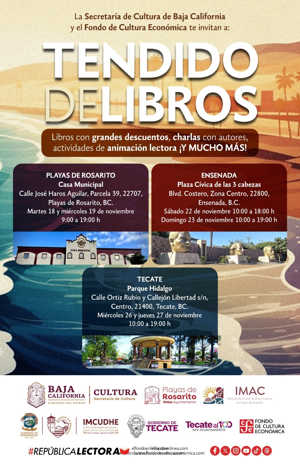CIUDA DE MÉXICO, 11 de noviembre de 2025.- Entre el 18 y el 27 de noviembre, el Fondo de Cultura Económica (FCE) y el Gobierno de Baja California, a través de la Secretaría de Cultura del estado y en coordinación con los Ayuntamientos de Ensenada, Tecate y Playas de Rosarito, realizarán tres tendidos de libros con el propósito de fortalecer el hábito de la lectura entre la población de la entidad.