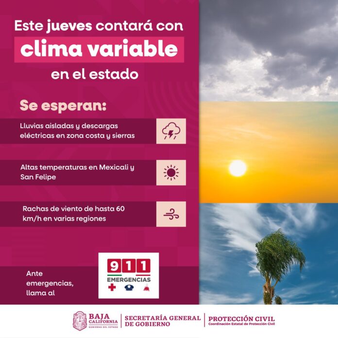 TIJUANA BC, 16 de julio de 2025.– La Coordinación Estatal de Protección Civil (CEPC) informa que, de acuerdo con el pronóstico de la Comisión Nacional del Agua (CONAGUA), este jueves 17 de julio Baja California presentará condiciones de tiempo variadas. En la zona costa y zonas serranas de la entidad se esperan lluvias aisladas con descargas eléctricas y nubosidad, mientras que en el este del estado se mantendrán temperaturas altas, con ambiente caluroso y cielo despejado.