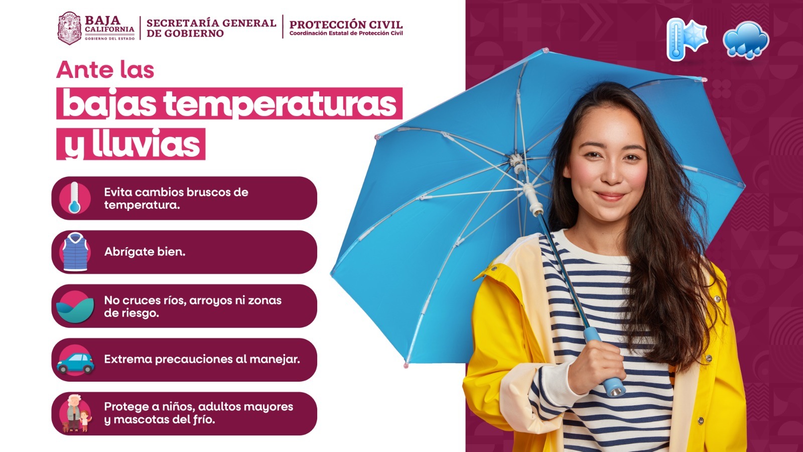 MEXICALI BC, 24 de enero de 2025.- La Coordinación Estatal de Protección Civil (CEPC) informó que durante los próximos días tendremos condiciones que generarán lluvias, vientos y un ambiente de frío a muy frío durante las mañanas y noches en Baja California. Estas condiciones persistirán durante los próximos días, afectando diversas regiones del estado.