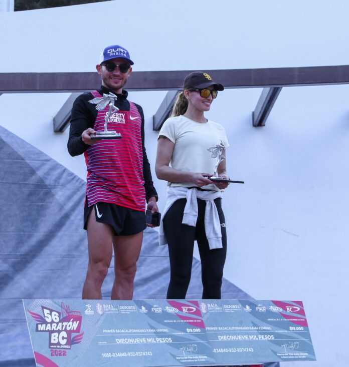 MEXICALI BC, 12 de diciembre de 2022.- Los mexicalenses Daniel “Pollo” Valdez en varonil e Ivette Sandoval en femenil se convirtieron en los mejores bajacalifornianos del 56 Maratón Baja California.