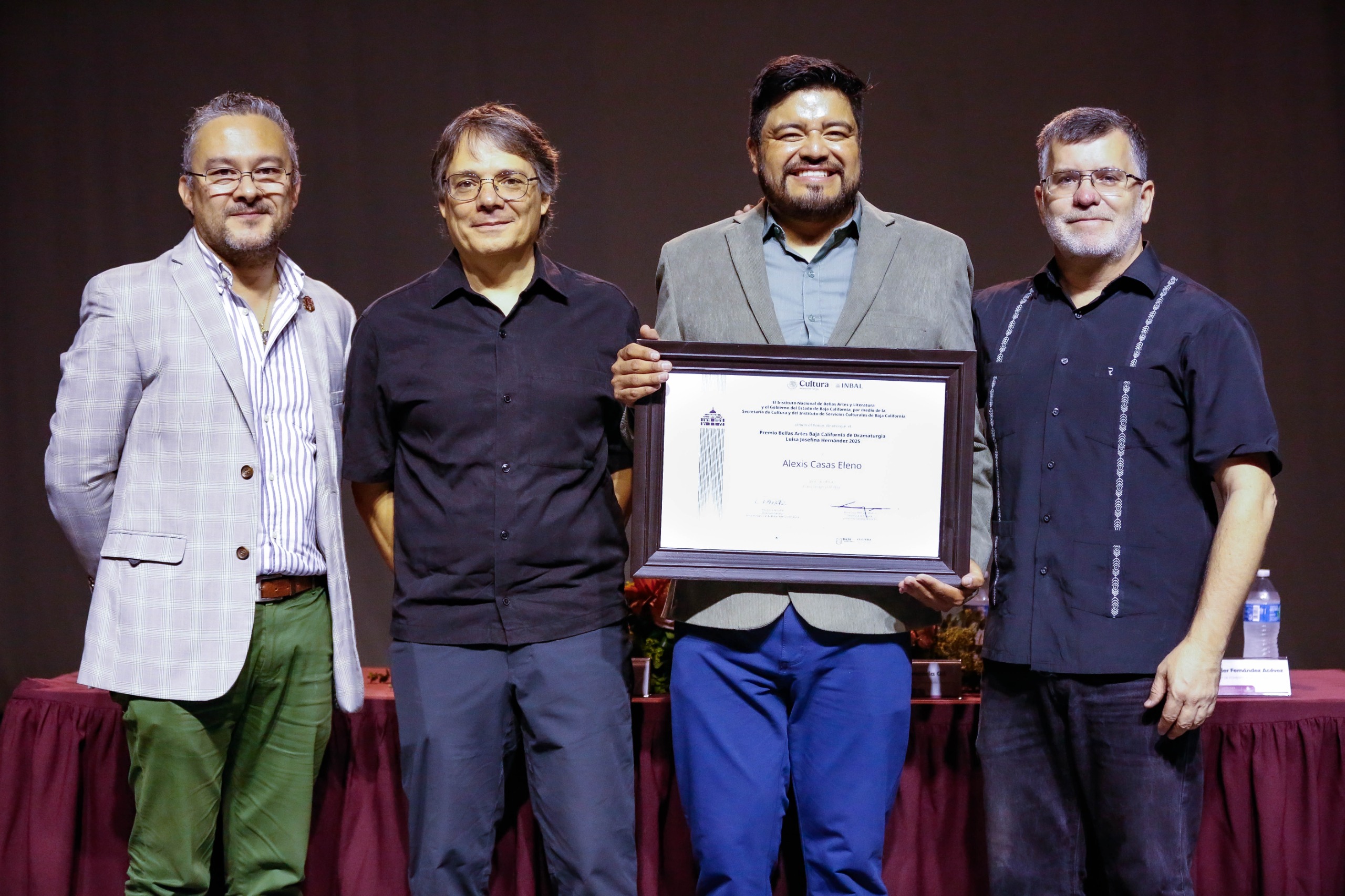 TIJUANA BC, 18 de septiembre de 2025.- La Secretaría de Cultura del Gobierno de México y el Instituto Nacional de Bellas Artes y Literatura (INBAL), a través de la Coordinación Nacional de Literatura (CNL), en colaboración con el Gobierno del Estado de Baja California, mediante la Secretaría de Cultura y el Instituto de Servicios Culturales de esta entidad, entregaron el Premio Bellas Artes Baja California de Dramaturgia Luisa Josefina Hernández 2025 a Alexis Casas Eleno por su obra Para llegar a Roma. La ceremonia se realizó este jueves en el Foro Experimental del CEART, en Mexicali, Baja California.