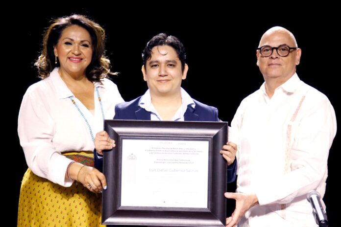 MEXICALI BC, 23 de agosto de 2024.- El escritor Luis Daniel Gutiérrez Salinas, recibió el Premio Bellas Artes Baja California de Dramaturgia “Luisa Josefina Hernández” 2024 por su obra Mariana viene cada mañana. La ceremonia se llevó a cabo en el Foro Experimental del Centro de las Artes de Baja California en Mexicali (CEART).