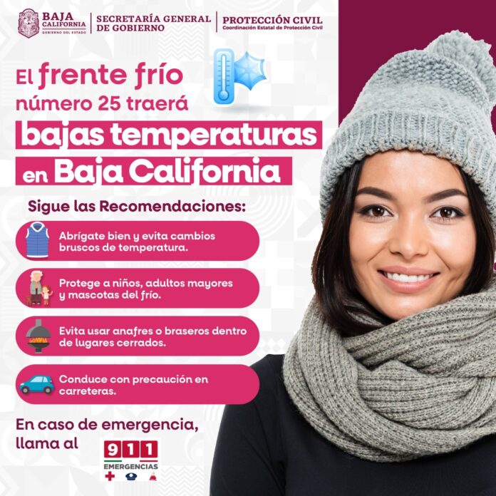 TIJUANA BC, 28 de enero de 2025.- La Coordinación Estatal de Protección Civil (CEPC) de Baja California informó que el frente frío número 25 afectará diversas regiones del territorio estatal, generando un ambiente frío a gélido, especialmente en las zonas montañosas. Este fenómeno estará acompañado de la posibilidad de caída de aguanieve en las sierras Juárez y San Pedro Mártir.