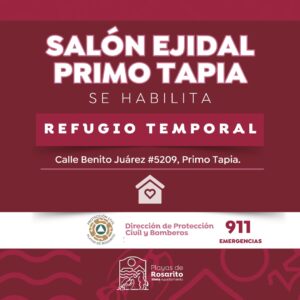 Es por ello que se habilitan los refugios temporales en la Unidad Deportiva Profesor Andrés Luna (Colonia Reforma) y en la zona sur en el Salón Ejidal Primo Tapia. (Carretera Libre Rosarito Ensenada).