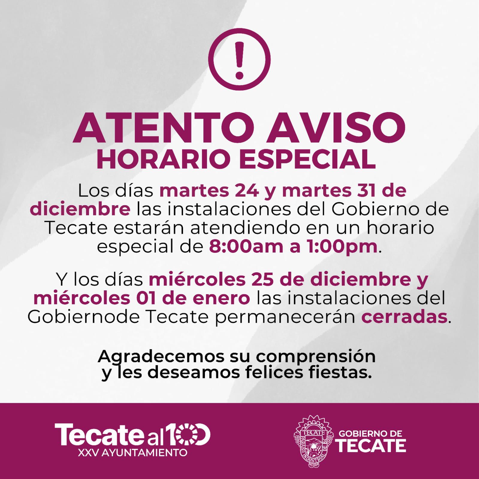 TECATE BC, 23 de diciembre de 2024.- El Gobierno Municipal de Tecate, informa a la comunidad que, con motivo de las celebraciones navideñas y de fin de año, se realizarán ajustes en los horarios de atención de las oficinas municipales.