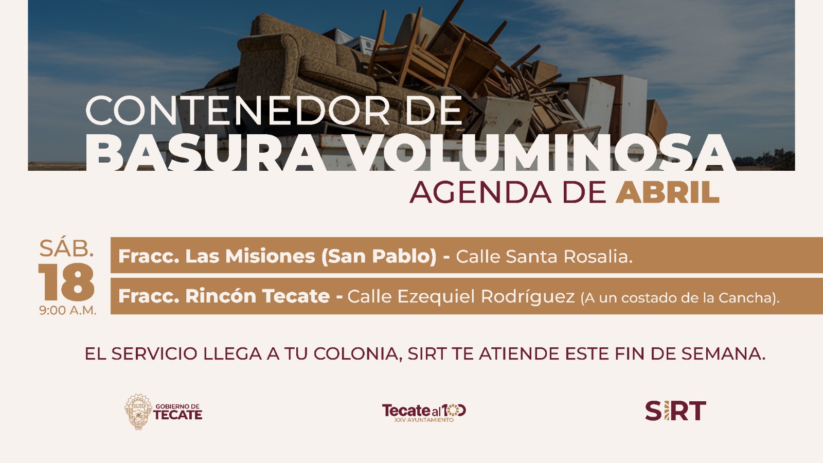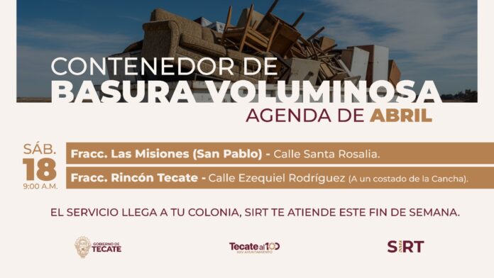 TECATE BC, 16 de abril de 2026.– El Gobierno de Tecate, a través de Servicios Integrales de Residuos de Tecate (SIRT), informa a la comunidad sobre la instalación de contenedores para la disposición de basura voluminosa este sábado 18 de abril, a partir de las 9:00 de la mañana, como parte de las acciones para fortalecer la limpieza en la ciudad.