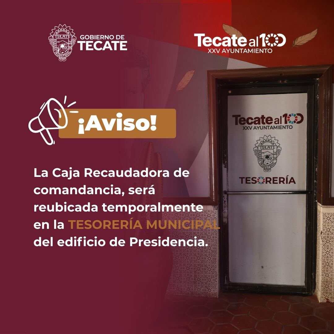 TECATE BC, 27 de marzo de 2025. – El Gobierno de Tecate informa que la caja recaudadora de la Dirección de Seguridad Ciudadana será reubicada a partir de hoy en la Tesorería Municipal debido a trabajos de mantenimiento y mejora en el sistema.