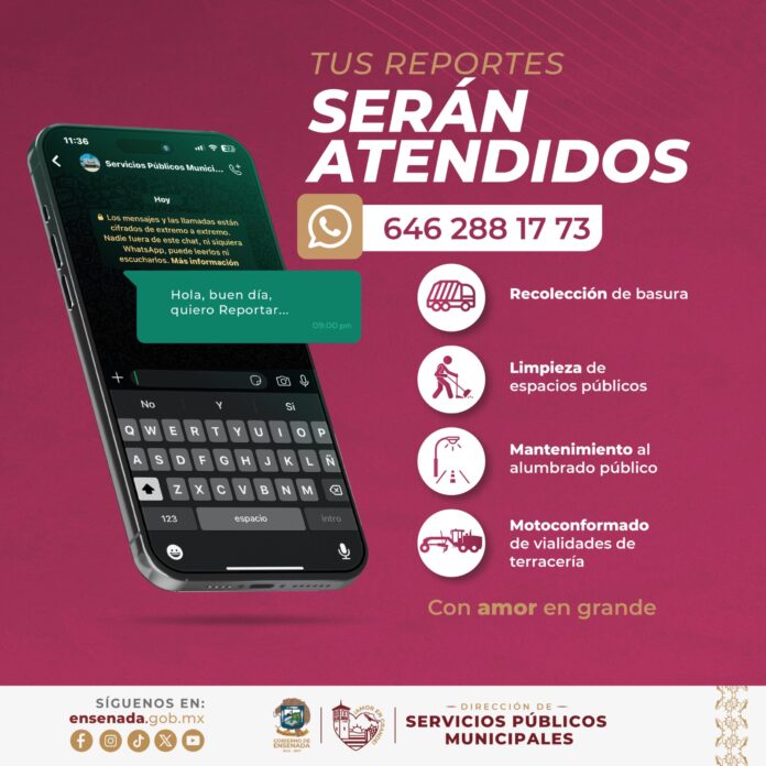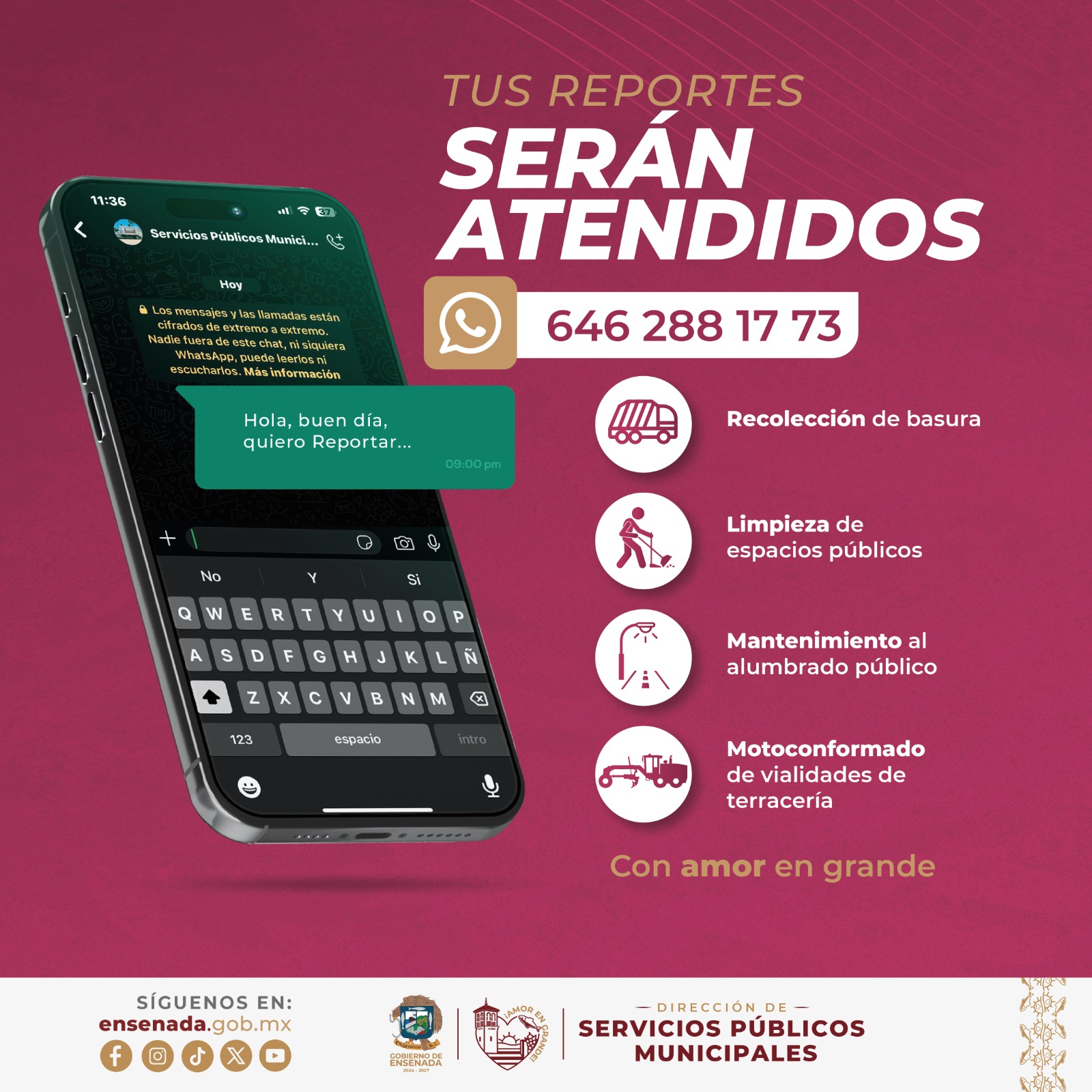 ENSENADA BC, 29 de septiembre de 2025.- El Gobierno de Ensenada reitera a la población que los reportes relacionados con el servicio de recolección de basura, únicamente se reciben vía mensaje en la línea de WhatsApp 646 288 17 73.