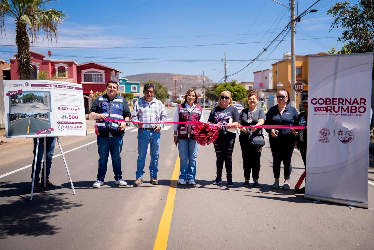 ENSENADA BC, 10 de abril de 2026.- Con la pavimentación de 8 mil 603.83 metros cuadrados, equivalente a 19 cuadras, de la avenida Paseo del Real, el Gobierno de Ensenada transforma la vida de más de 500 familias de Villas del Real VII.