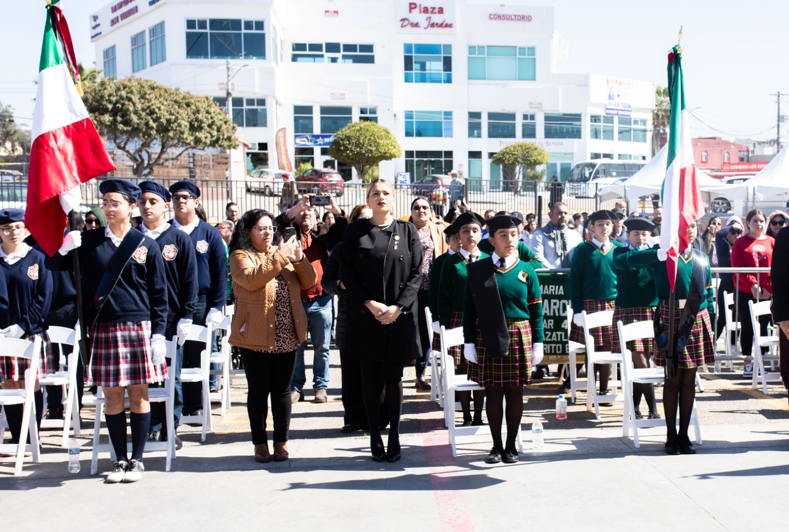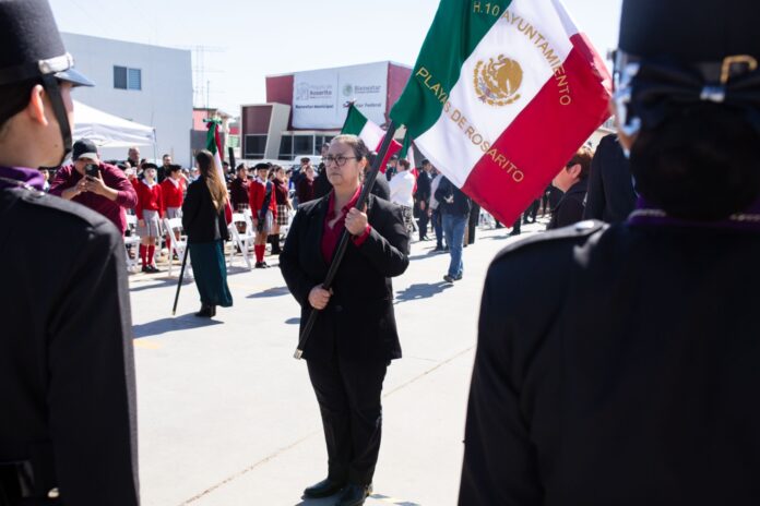 PLAYAS DE ROSARITO BC, 24 de febrero de 2025.- Con motivo del 24 de febrero, Día de la Bandera Nacional, el 10mo. Ayuntamiento de Playas de Rosarito, realizó una jornada cívica que inició con el izamiento de Bandera, seguido por un desfile de escoltas, la ceremonia de incineración de Bandera y el abanderamiento de instituciones educativas.
