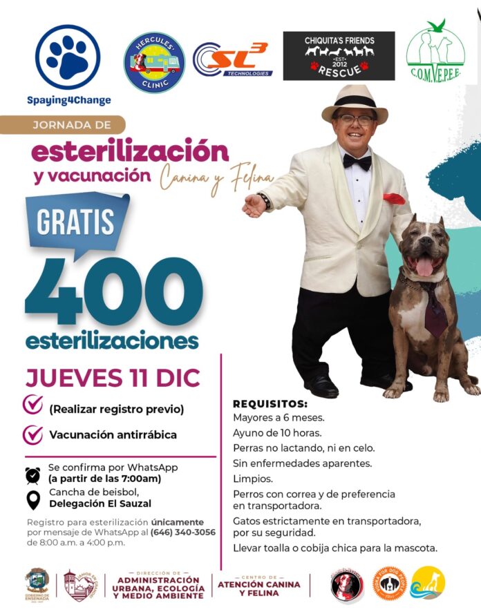 ENSENADA BC, 30 de noviembre de 2025.- Como parte del compromiso con el bienestar animal y la tenencia responsable de mascotas, el Gobierno de Ensenada que encabeza la presidenta municipal Claudia Agatón Muñiz, en coordinación con la asociación civil Shorty’s Rescue, llevará a cabo una macrojornada gratuita de esterilización con meta de 400 procedimientos.