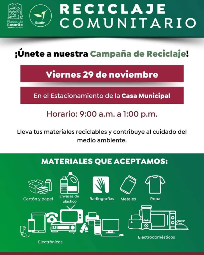 PLAYAS DE ROSARITO BC, 27 de noviembre de 2024. – El Gobierno de la Ciudad, encabezado por la presidenta Rocio Adame Muñoz, a través del Instituto Municipal de la Juventud (Imjuver) y en alianza con Ewally, convoca a toda la comunidad a participar en la “Campaña de Reciclaje”; el viernes 29 de noviembre de 9:00 a 12:00 horas en el estacionamiento de la Casa Municipal.