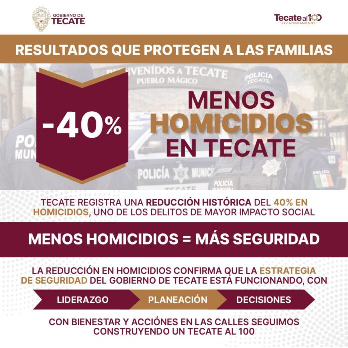 TECATE BC, 20 de enero de 2026.- Debido a una estrategia integral de seguridad, el municipio de Tecate registra una reducción en la incidencia delictiva, particularmente en delitos de alto impacto.