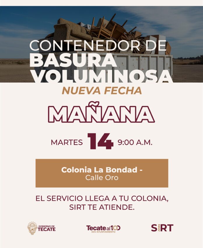TECATE BC, 13 de abril de 2026.– Como parte de la estrategia permanente para mantener un Tecate más limpio, ordenado y en mejores condiciones para todas las familias, el Gobierno de Tecate informa que este martes 14 de abril se instalará un contenedor para la recolección de basura voluminosa en la colonia La Bondad, sobre calle Oro.