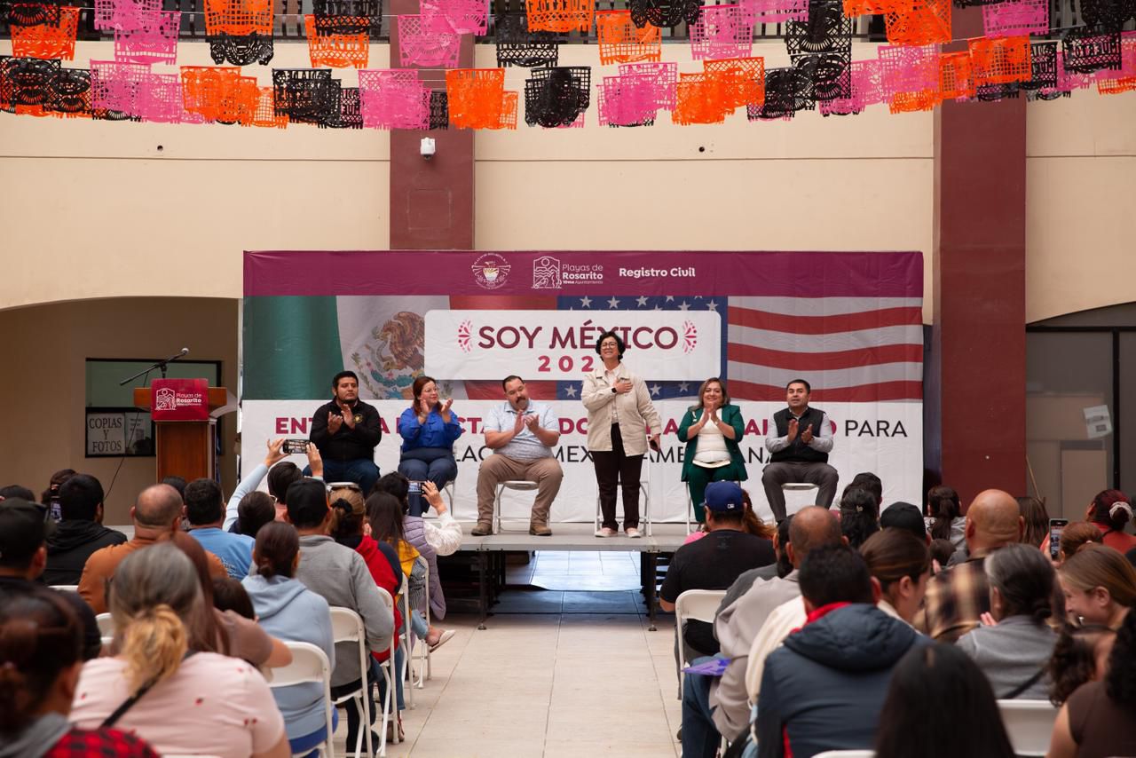 Durante la ceremonia se realizó la entrega simbólica de cinco actas de doble nacionalidad, en representación de los más de mil rosaritenses beneficiados, entre niños, jóvenes y adultos, quienes ahora cuentan con el reconocimiento legal de su identidad binacional.