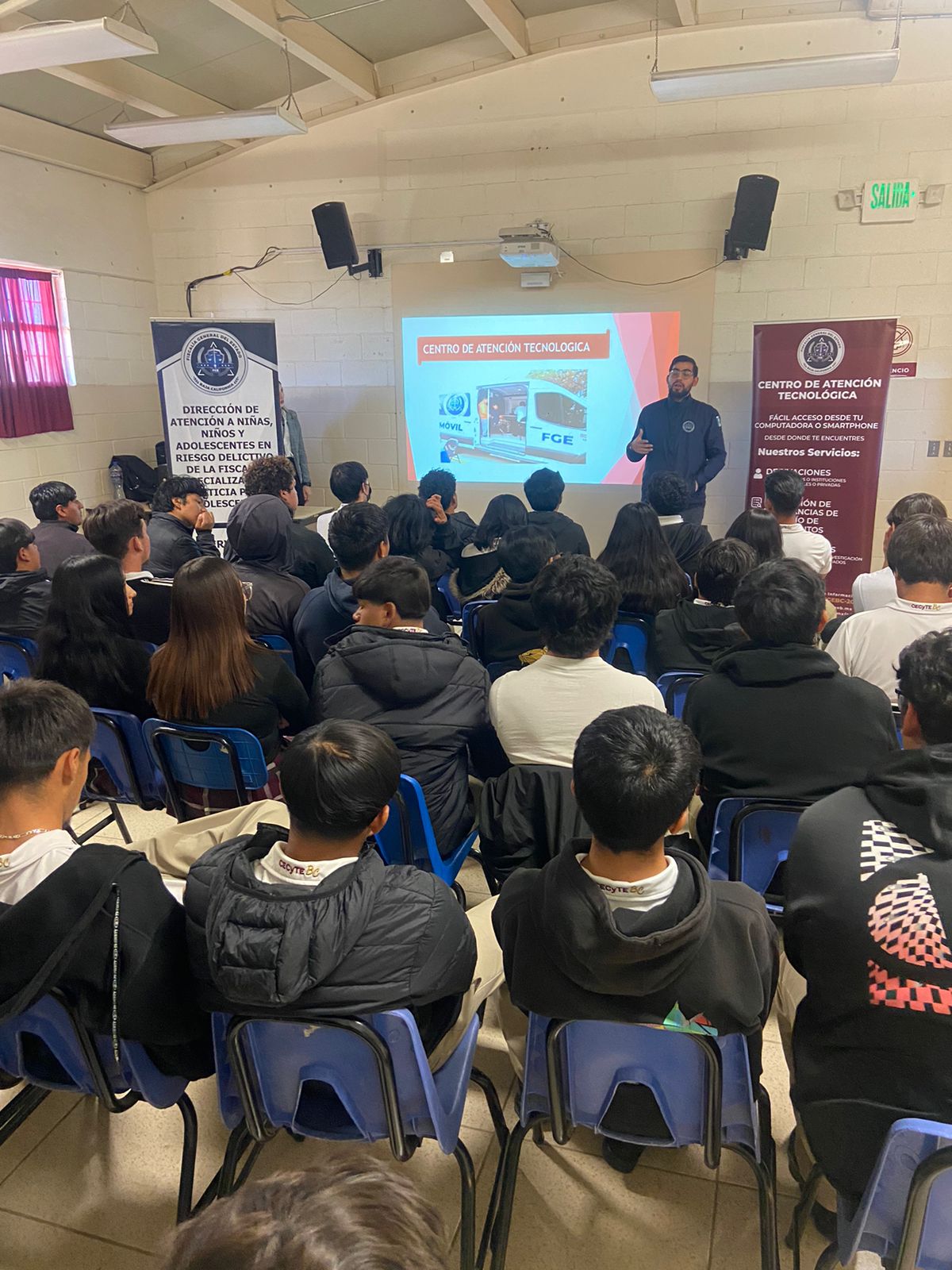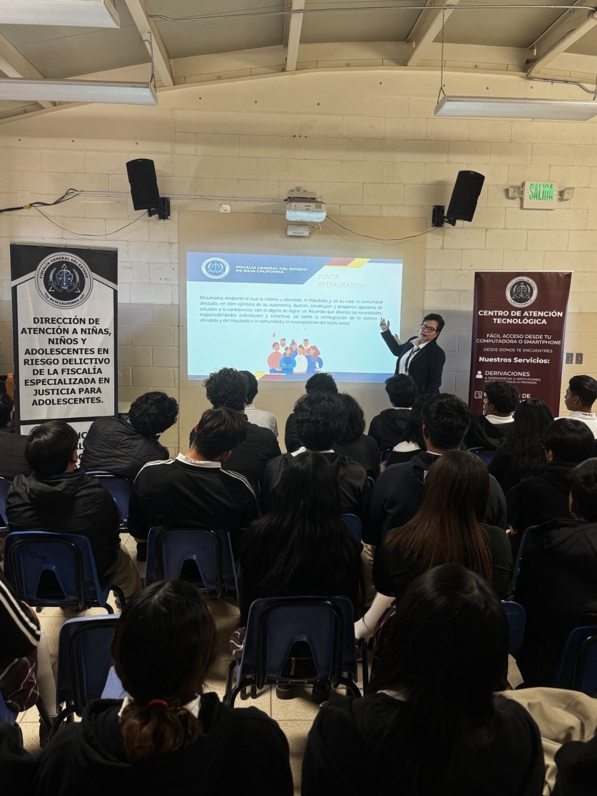 TECATE BC, 10 de noviembre de 2025.- La Dirección de Atención a Niñas, Niños y Adolescentes de la Fiscalía Especializada en Justicia para Adolescentes, llevó a cabo el taller “Fiscalía en tu Escuela” en el Centro de Estudios Científicos y Tecnológicos (CECyTE) de Tecate. Este evento, que tuvo lugar en las instalaciones del CECyTE, tuvo como objetivo sensibilizar a la comunidad estudiantil sobre la importancia del respeto, la convivencia sana y pacífica, tanto dentro como fuera del aula, promoviendo, además, la cultura de la denuncia ante situaciones irregulares que pudieran enfrentar.